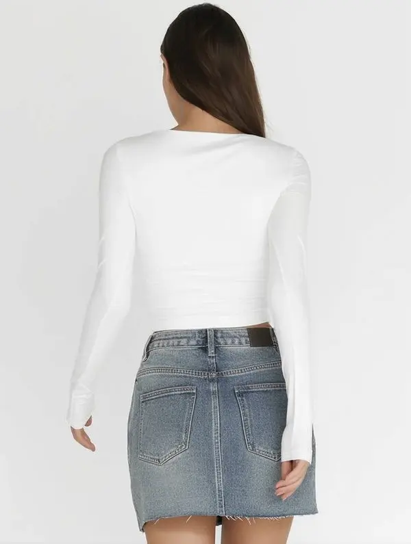 A cropped top with a boat neckline and long sleeves. The solid design presents a clean and minimal outline suited to transitional seasons.