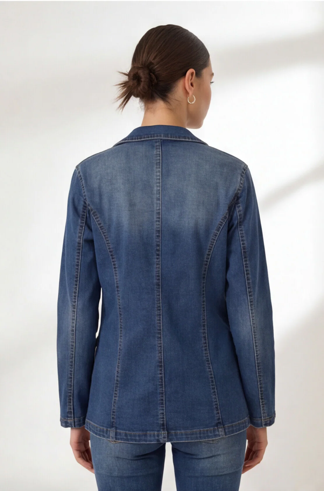 This blazer has a structured denim design with a straight, hip-length cut. The front is finished with a button closure, while long sleeves and a defined neckline give the piece a clear blazer profile. Visible seam lines follow the jacket structure.