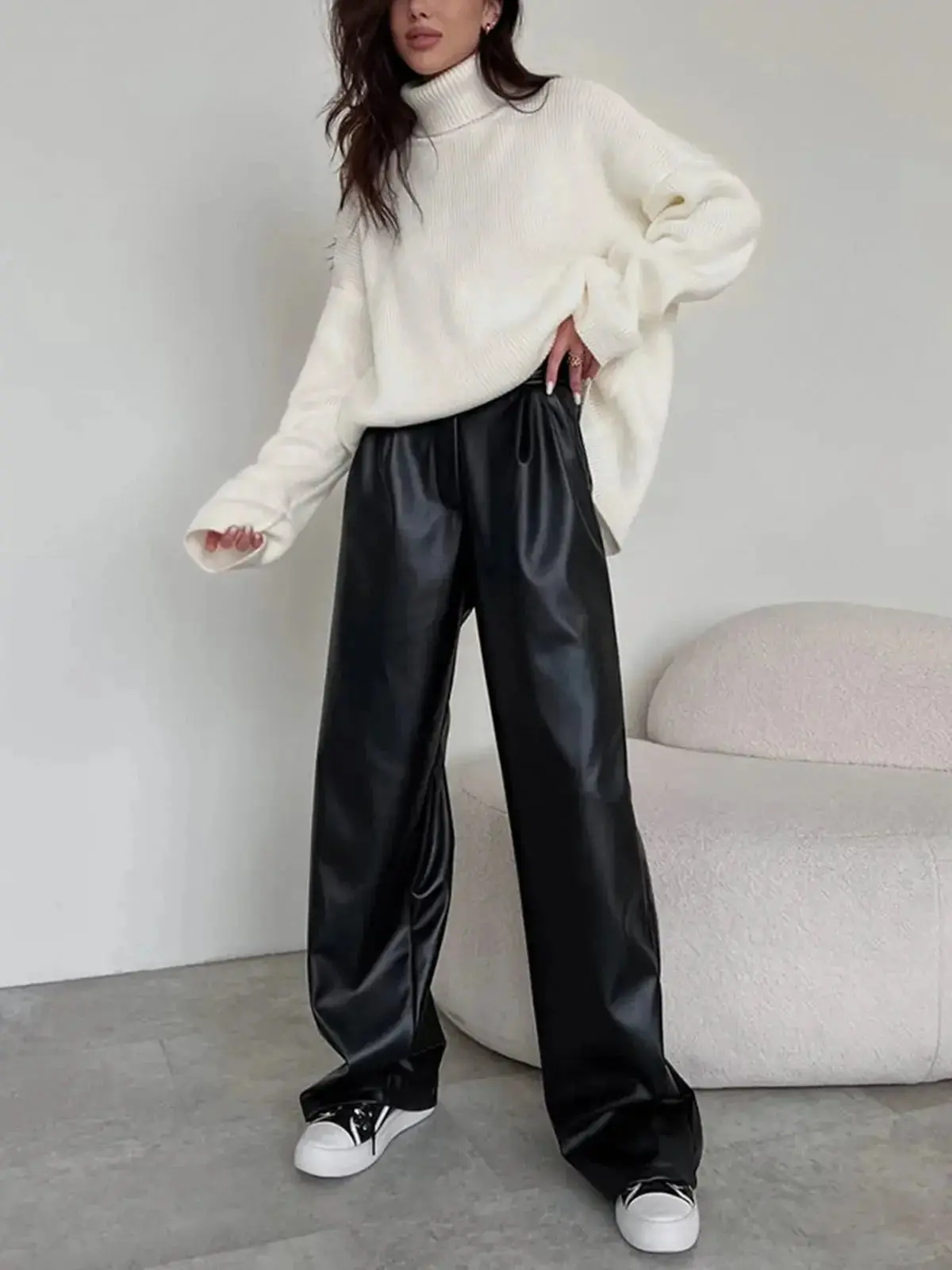 High-rise trousers in a wide-leg cut with a clean front for a streamlined look. The coated faux material gives a uniform surface, while a fixed waistband with belt loops frames the waist with subtle pleats at the front.
