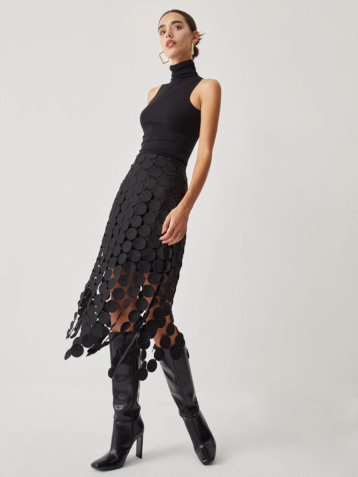 MEWE | High Waisted Laser Cut Midi Skirt with Circular Cutouts