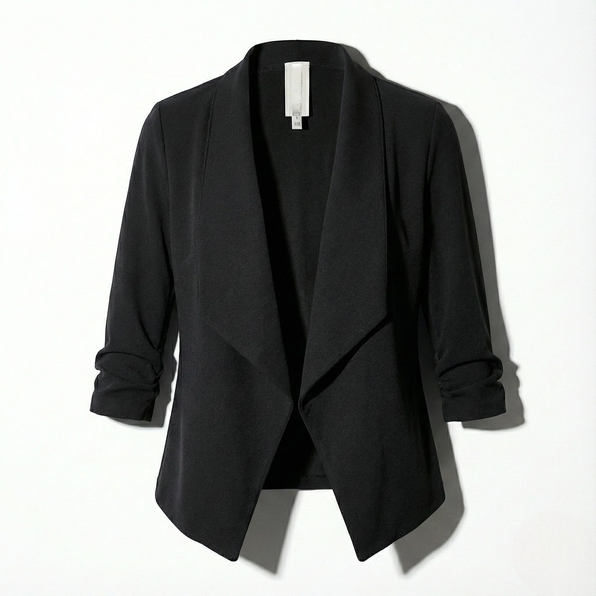 This open front blazer has a collarless neckline with a draped lapel and a fluid front edge. The straight silhouette is defined by a structured shape and three-quarter sleeves with subtle gathering at the cuffs. The front remains open without visible closures, creating a clean, layered profile.